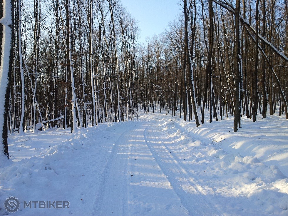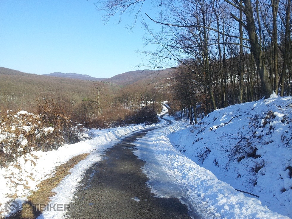 5. Zajkova chata - Čajkov: asfaltová cesta od Zajkovej chaty smerom na Čajkov bola odhrnutá len krátky úsek, po prvú závoru, ktorá je na križovatke smerov na Vartu a na Čajkov (závora pri hospodárskej budove). Musel som ísť snehom peši, no našťastie sneh bol tvrdší a aspoň bicykel sa dal tlačiť, neprepadával sa. Asi po 1 km takéhoto úseku som bol zachránený, bola tam koľaj od auta, po ktorej sa dalo celkom dobre spustiť opatrne do zjazdu.