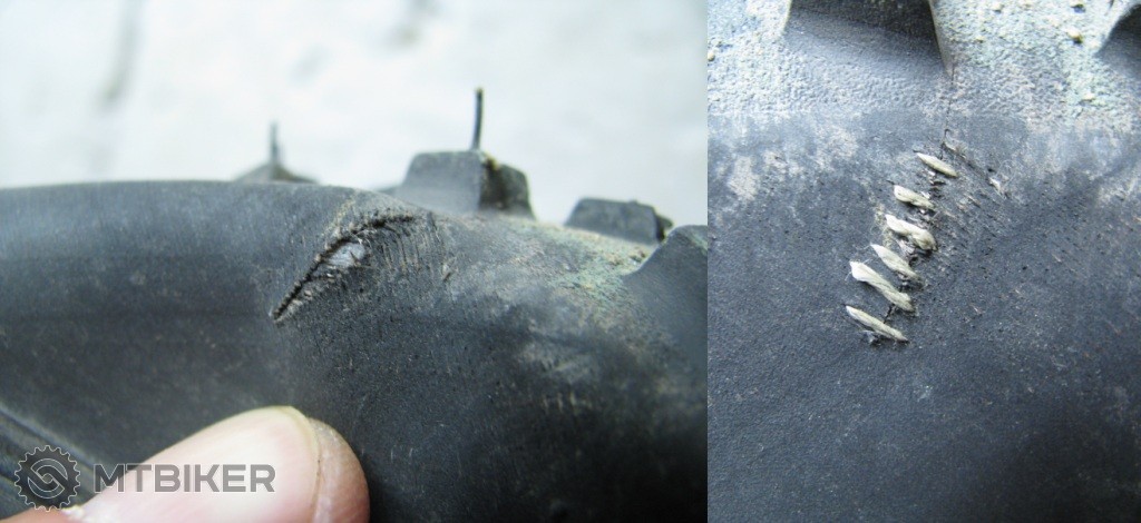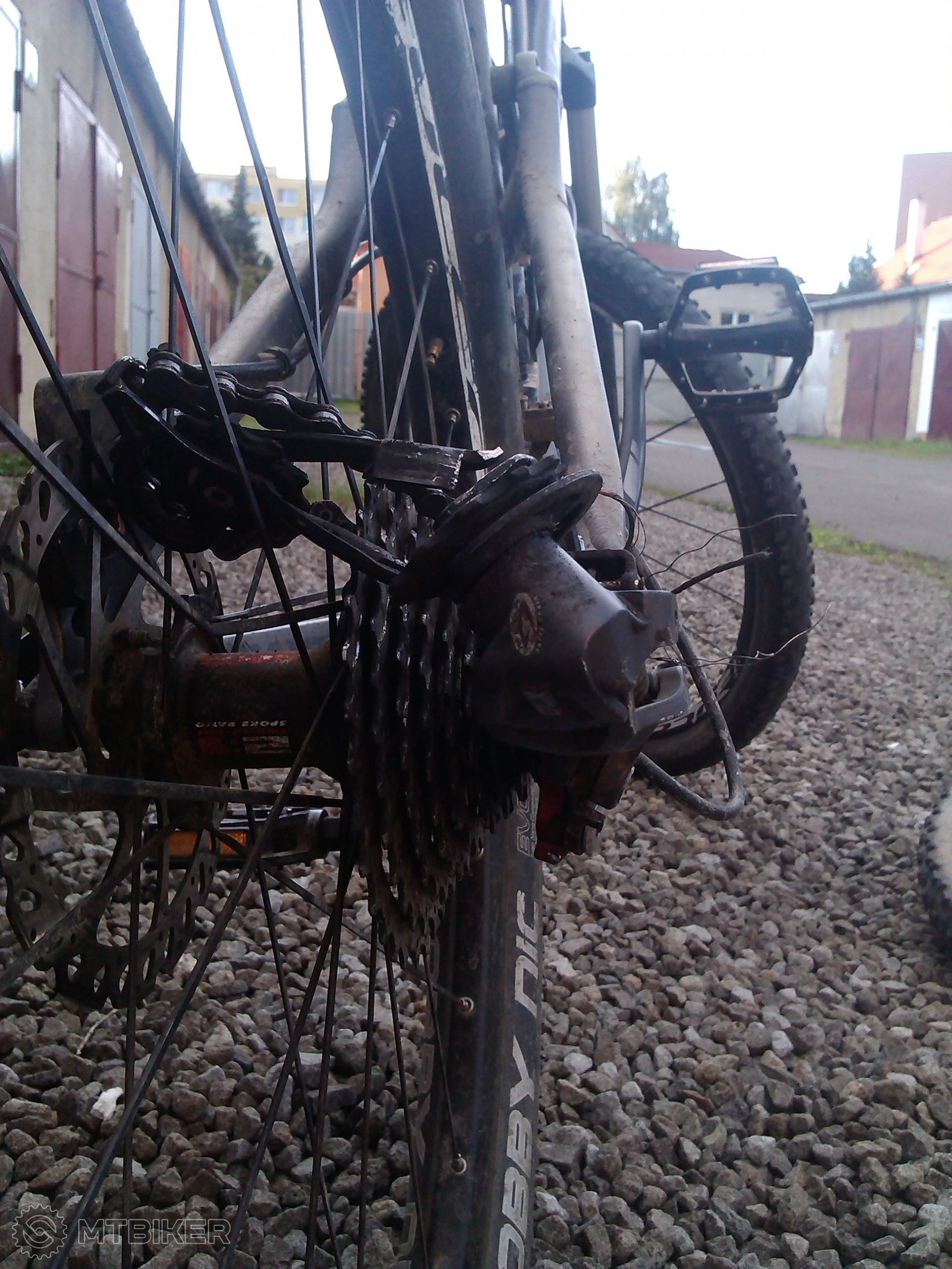 Vsetko to bola moja vina, pretoze som niekolko tyzdnov vedome jazdil s prasknutym rafikom. Bola to len taka mala vlasocnica hned vedla nipla a nevenoval som jej pozornost. Dnes sa mi to vsak vypomstilo. Pocas jazdy mi presne v tom prasknutom mieste vytrhlo spic aj s niplom a ten vbehol do retaze a prehadzovacku vtiahlo do vypletu. V pravej casti fotky vidiet ten krater v rafe. Vysledkom je znicena prehadzovacka, zlomena patka a niekolko prasknutych spic. Lenze poskodene su aj dalsie spice, nakolko sa retaz dostala medzi kazetu a vyplet. O rafiku ani nehovorim. Ten praskol asi na troch miestach. Takze "zarobeno". Ale nastastie sa to zaobislo bez ujmy na zdravi.