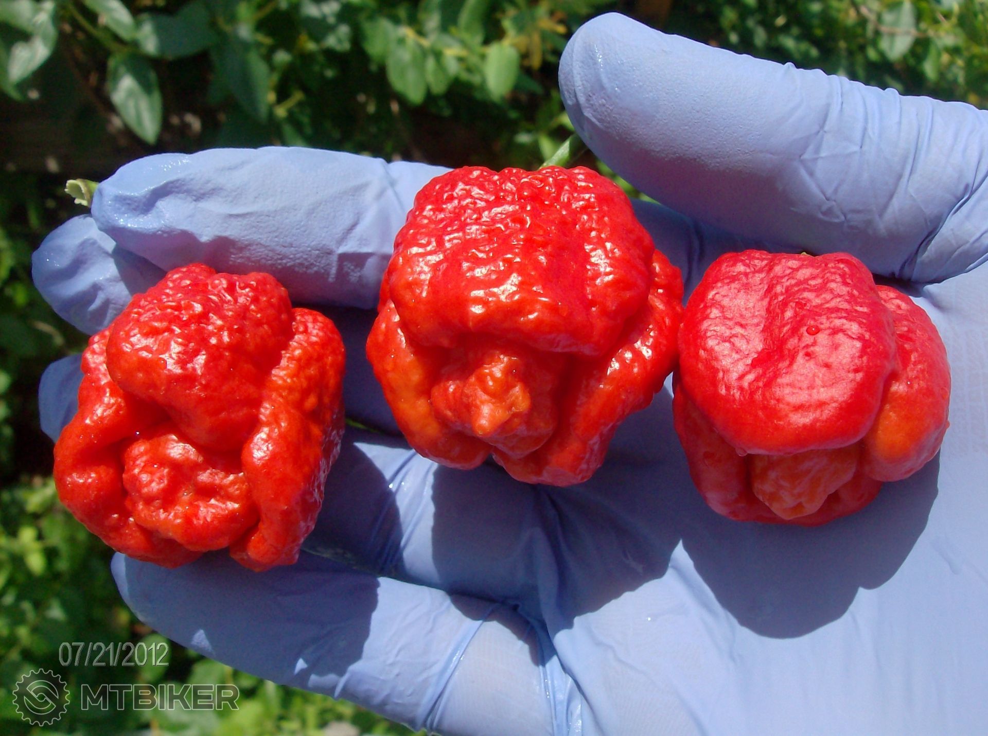 kto inak pride do Castej na gulas v sobotu, mozem mu dat ochutnat moju urodu (na foto) TMS - Trinidad Moruga Scorpion ..... dobre vidite, zbiera sa to v latexovych rukaviciach!!! a SHU 2 000 000