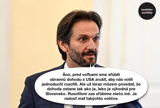 No tak v realite sa zase Smeráci správajú inak - s výnimkou pomäteného Blahu (ten je mimo úplne). Napríklad Kaliňák hovorí, že Amíci sú féroví a žiadnu obrannú zmluvu rušiť nechcú. Povedal to v konšpiračnom rádiu Slobodný vysierač. (s prepáčením)