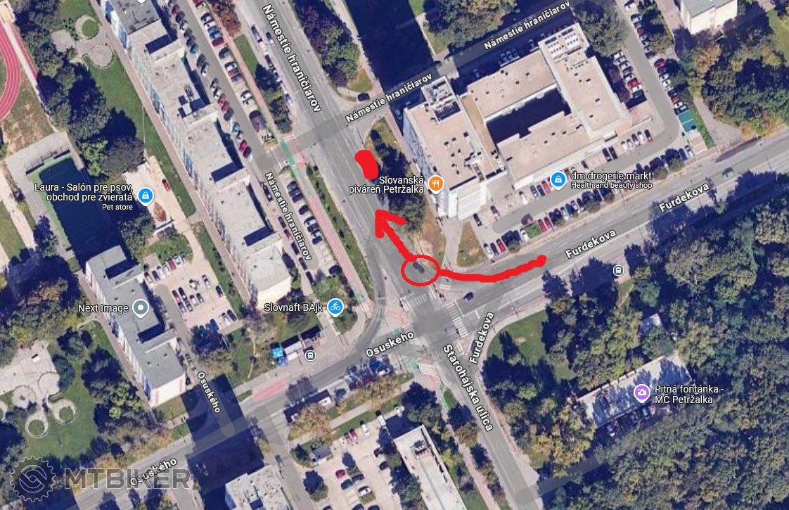 Urcite viaceri z vas chodia cez Namestie hraniciarov v Petrzalke, ja kazdy pracovny den (trasa je oznacena cervenou na obrazku) - vsimam si, ze pod tou "novou" bytovkou na rohu Furdekovej a Namestia hraniciarov pravidelne stoji biela Octavia tak, ze blokuje jeden z dvoch pruhov. Je tam povolene takto parkovat?
