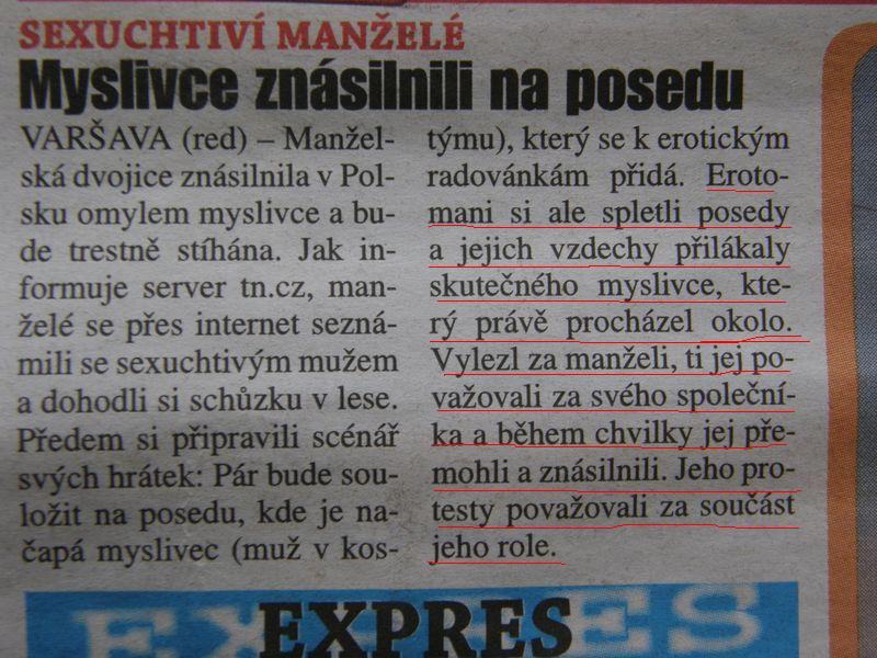 „Ale áno, práve nedávno ku mne prišla ženská, síce chudšia, ale celkom pohľadná a tak som ju hneď vytrtkal na kanape a pretože som mal v sebe tu fľašku vína, tak hneď zasa na pohovke. Bola z toho úplne vyjavená a keď sa za ňou zatvorili dvere, tak hneď zaklopala znova a keď som jej otvoril, tak sa ospravedlňovala za rušenie, vraj si u mňa zabudla v obývačke kosu!!!“