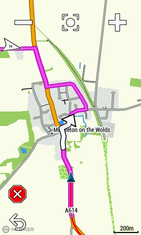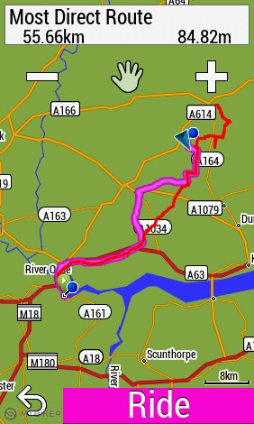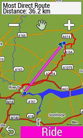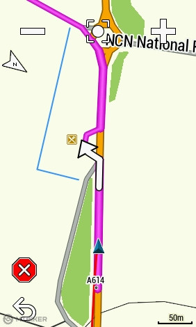 V Driffielde som sa rozhodol pre návrat lebo lialo. Navigácia ma mala logicky poslať po ružovej A 614, ale tej sa vyhýba, lebo je to najvyššia kategória. Druhá najkratšia cesta bola po A164, ktorej sa ale tiež vyhla a poslala ma späť kadiaľ som prišiel, cez Skerne. Lenže v Hutton Cranswick ma poslala úplne nelogicky po A164, ktorej sa pôvodne vyhla, smerom na Beverley. Nedržala sa ani pôvodnej trasy, po ktorej som prišiel, ale zvolila 15 km obchádzku. Tak som sa vrátil naspäť a pomocou telefónu sa dostal na A614. Odtiaľ celú cestu pípala a snažila sa stále odbočovať alebo otáčať. Obchádzať trasu cez parkoviská a rôzne uličky. Horná trasa na mape je návrat, spodná je pôvodná naplánovaná cesta, po ktorej som išiel tam.